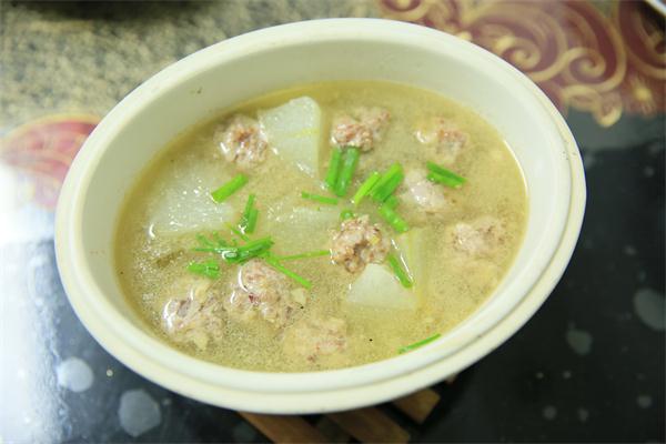 制作方法:夾心肉洗凈、剁碎,火腿切丁,生姜切末,備用;將上述材料混合,加入適量鹽、糖和料酒,再加入一個蛋清,用手混合均勻,再反復摔打至少10分鐘,至肉有彈性,再捏成大小適宜的小球,備用;豬大骨熬湯,備用;冬瓜洗干凈、切片,起油鍋略炒,加入大骨湯,燒開后逐一放入肉丸,再根據(jù)個人口味加入鹽等調(diào)味料,待肉丸燒熟即可起鍋。