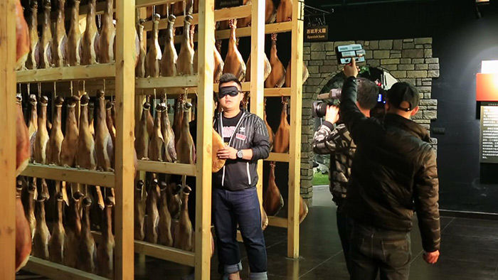 浙江第一美食類電視欄目《廚星高照》的主持人陳黃臻號(hào)稱美食小霸王,肉食主義捍衛(wèi)者。來到巴瑪火腿的第一件事就是游覽展示了各種火腿文化的世界火腿博覽館,在這里黃臻不僅了解了世界各地的火腿品種,而且還展示了盲眼摸腿的技藝,令巴瑪火腿的工作人員也是連連贊賞。