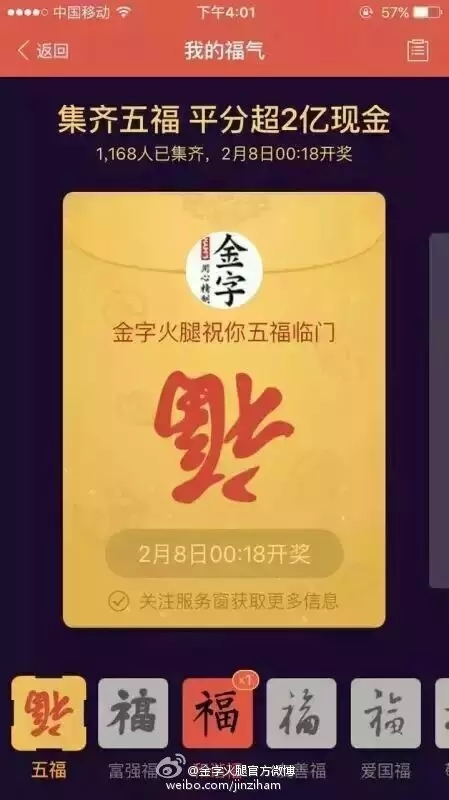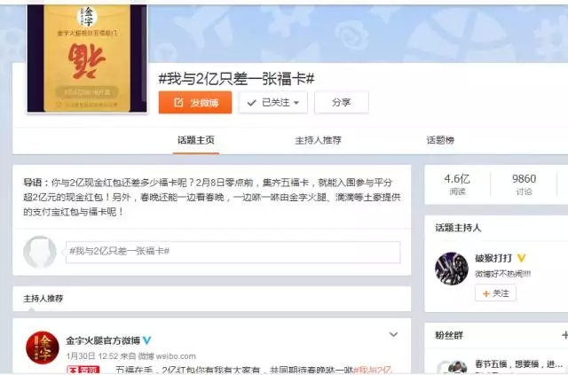 自前幾天支付寶將“集5福,搶2億+紅包”的活動規(guī)則公布后,一時(shí)間,有關(guān)??〒Q贈的話題強(qiáng)行霸屏。在有金字粉絲集齊了五福后,金字順勢在微博平臺上策劃的#我與2億只差一張???的微話題就引發(fā)了高達(dá)4.6億的閱讀量,網(wǎng)友們通過點(diǎn)贊評論及轉(zhuǎn)發(fā)分享的方式,第一時(shí)間表達(dá)了自己對于五福??ê痛和?億紅包的高度期待!